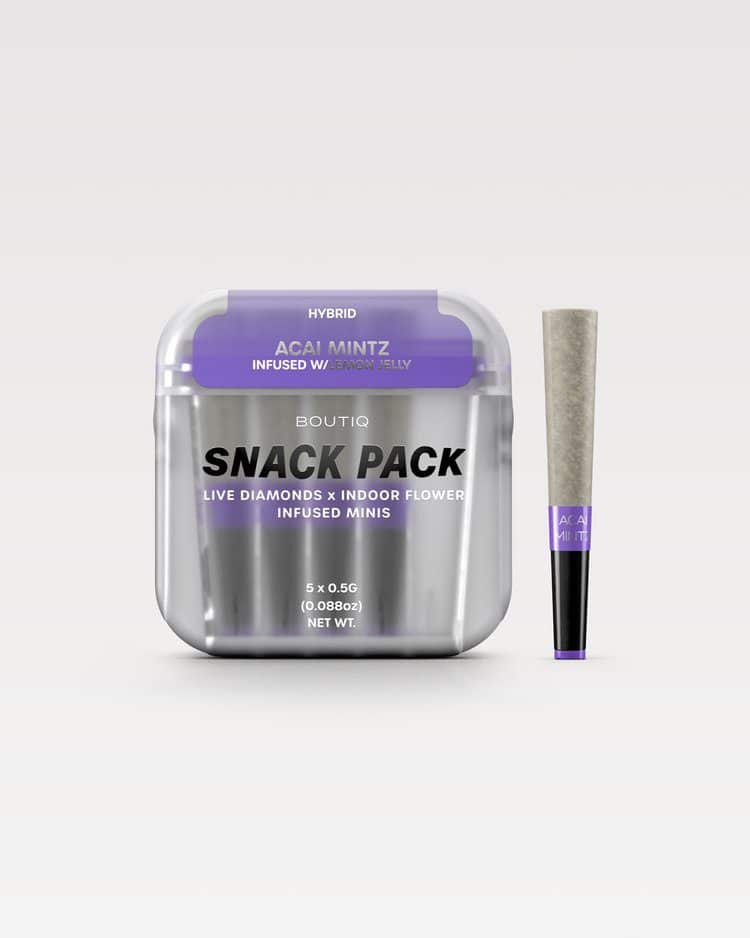 The Boutiq Snack Pack Live Diamonds 2.5G Minis – Acai Mintz Infused with Lemon Jelly delivers a flavorful and energizing cannabis experience in a convenient format.