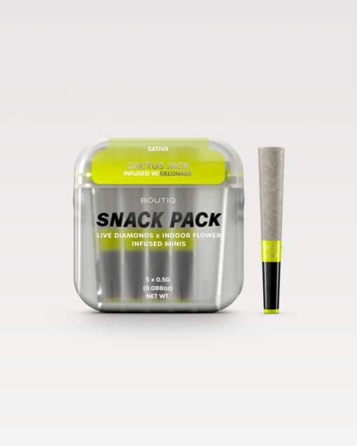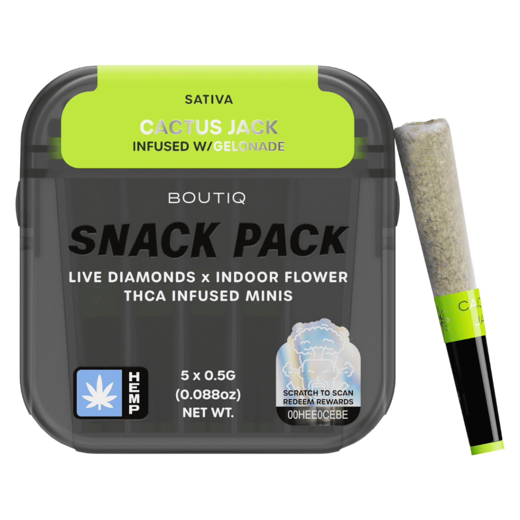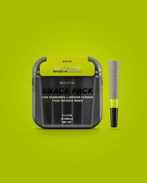 For a flavorful, feel-good experience that fuels your focus and fires up your creativity, reach for the Boutiq Snack Pack Live Diamonds 2.5G Minis – Cactus Jack infused with Gelonade.