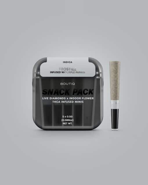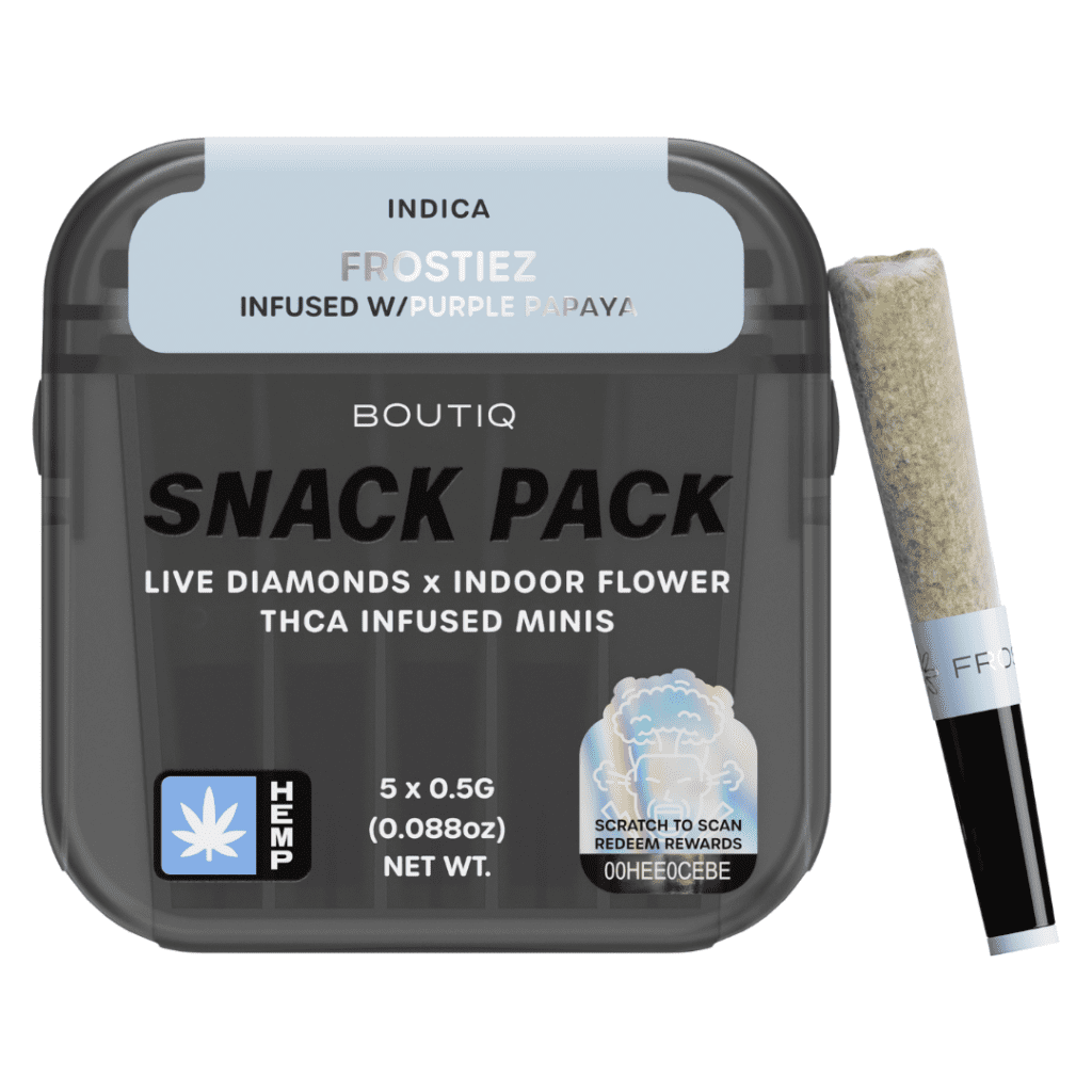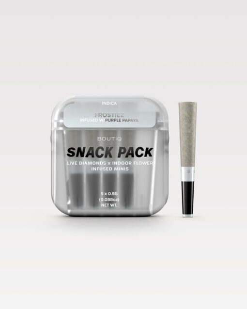For those who demand premium quality and unmatched potency, the Boutiq Snack Pack Live Diamonds Minis – Frostiez infused with Purple Papaya is your go-to Indica indulgence.