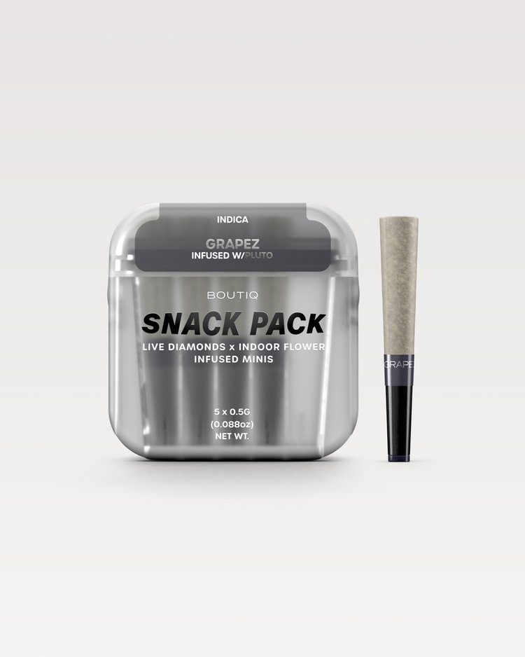 Each Boutiq Snack Pack includes five 0.5g mini pre-rolls, totaling 2.5 grams of premium cannabis.