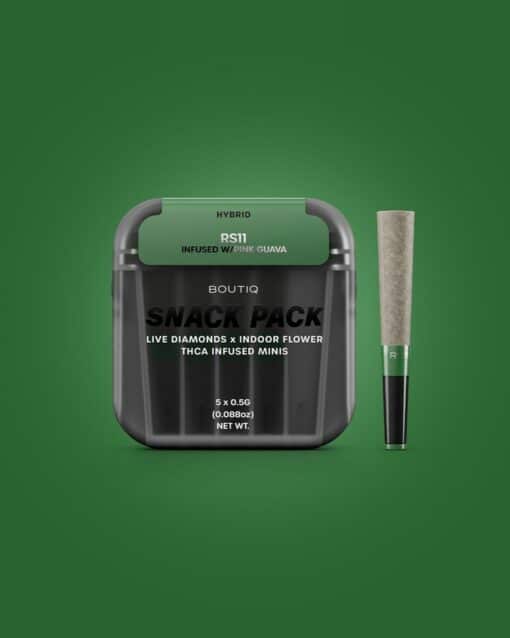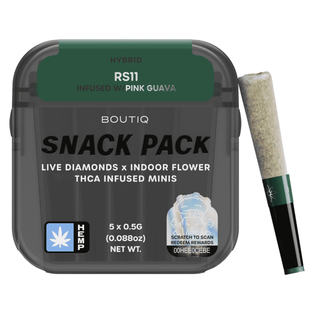 For a versatile, flavorful Hybrid experience with premium potency, try the Boutiq Snack Pack Live Diamonds 2.5G Minis – RS11 infused with Pink Guava.