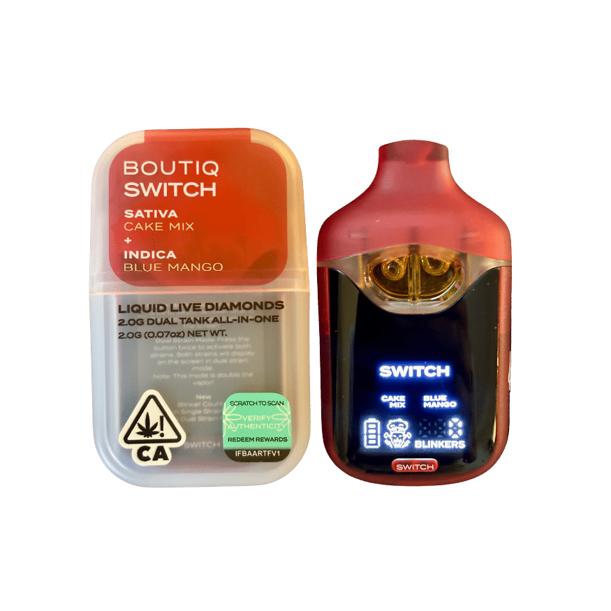 Experience a dessert-inspired high with the Boutiq Switch V4 Cake Mix x Blue Mango – 2G Disposable. This dual-strain vape blends creamy Cake Mix (Sativa) with tropical Blue Mango (Indica) in a high-potency, rechargeable device. Try it today! Feature Details Product Name Boutiq Switch V4 Cake Mix x Blue Mango – 2G Disposable Vape Strains Cake Mix (Sativa) + Blue Mango (Indica) THC Content 90.72% Total THC Oil Type 2g Liquid Live Diamonds Device Type Rechargeable Disposable Vape Technology Dual strain tanks, blend switch, digital display, USB-C charging Flavor Profile Sweet cake, vanilla, and tropical mango Effects Uplifting, mood-boosting, and smooth relaxation Use Case Day or evening use, flavor chasers, potency seekers Includes No charging cable (USB-C supported) Note If you like dessert-meets-fruit vapes, check out the Boutiq Switch V4 Sour Tangie x Grape Soda next.