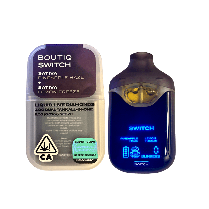 Experience the power of the Boutiq Switch V4 Pineapple Haze x Lemon Freeze Disposable – a 2G dual-strain vape with 92.70% THC, digital display, Liquid Live Diamonds, and premium flavor. Discover the best Boutiq Switch disposable vape today. Product Name Boutiq Switch V4 Pineapple Haze x Lemon Freeze – 2G Disposable Type Sativa Dual-Blend (Pineapple Haze + Lemon Freeze) THC Potency 92.70% Total THC Oil Type Liquid Live Diamonds Total Volume 2 Grams (2x 1g Dual Tanks) Rechargeable Yes – USB-C (Cable not included) Strains Pineapple Haze (Sativa) / Lemon Freeze (Sativa) Flavor Profile Tropical, tangy pineapple with a zesty lemon freeze twist Effects Uplifting, energizing, refreshing Display Digital screen with battery + blinker count Bonus Prefer something smooth and creamy? Try the Boutiq Switch V4 Honeycomb x French Cookies next!