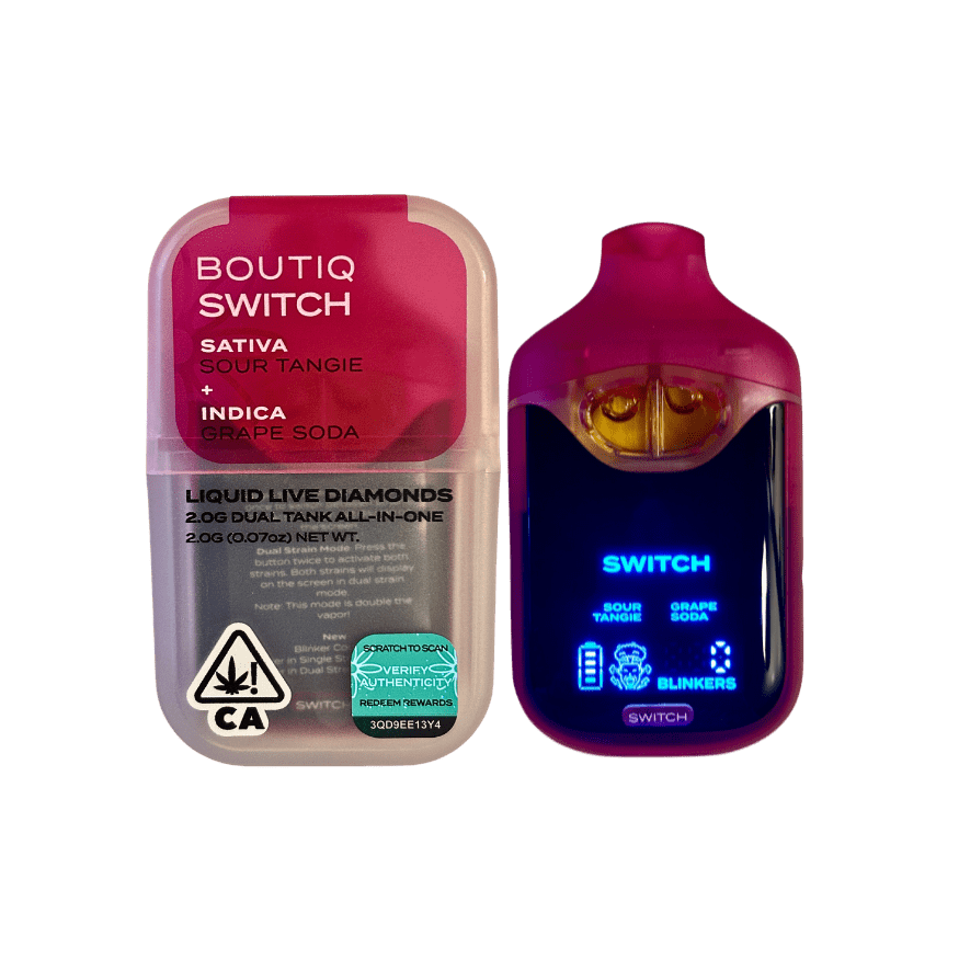 Boutiq Switch V4 Sour Tangie x Grape Soda – 2G Disposable Vape blends citrus and grape fizz in one dual-strain pen. 90.45% THC Liquid Live Diamonds. Rechargeable, award-winning design. Buy authentic at the best price! ⚡ Bold Citrus Meets Fizzy Grape — A Vape You Won’t Forget Product Name Boutiq Switch V4 Sour Tangie x Grape Soda – 2G Disposable Vape Strains Included Sour Tangie (Sativa) x Grape Soda (Indica) Oil Type Liquid Live Diamonds THC Potency 90.45% Device Type Rechargeable Disposable (USB-C) Capacity 2g (2 x 1g tanks) Flavor Profile Tangy citrus + sweet, fizzy grape soda Effects Energizing, uplifting, smooth relaxation Features Dual-strain switch, digital display, blinker counter, preheat How to Use One click to switch strains, two clicks to blend, hold to preheat Referral Also try the bold and fruity Boutiq Switch V4 Lime Z x Kiwi