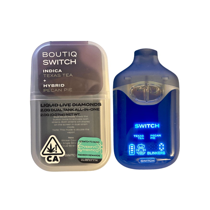 Experience bold Southern flavors with the Boutiq Switch V4 Texas Tea x Pecan Pie Disposable Vape – 2G of 93.65% THC Liquid Live Diamonds. Indica + Hybrid combo for smooth, decadent hits. Rechargeable & flavorful. Feature Details Product Name Boutiq Switch V4 Texas Tea x Pecan Pie – 2G Disposable Vape Device Type Boutiq Switch Disposable (V4) Strains Texas Tea (Indica) + Pecan Pie (Hybrid) Oil Type Liquid Live Diamonds THC Content 93.65% Total Volume 2 Grams (1g per strain) Blend Mode Smoke strains individually or together with blend feature Rechargeable Yes (USB-C, cable not included) Battery 350mAh – Up to 800 puffs Coil Type 1.6ohm Ceramic Coil – Smooth, clean vapor Special Features Digital display, usage blinker, preheat mode, dual-window tank design